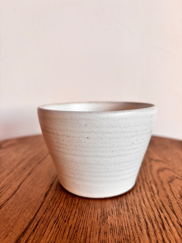 会津本郷焼の人気作家【樹ノ音工房】 白フリーコップです。 シンプルなマットの白い器は手になじむ素材で温かいお茶をいれてみたりアイスクリームやフルーツ、蕎麦ちょこにと多様にお使いいただけます。 お料理を選ばずにオールマイティに使え飽きの来ないデザインと使い勝手のよいサイズ感は長くお使いいただけることでしょう。ご自宅用はもちろん贈り物にも最適です! 素材:陶器(会津本郷焼) サイズ:直径上面9.5㎝底面6.5㎝ 高さ5.7㎝ ご使用上の注意 電子レンジ、食洗器対応 ※オーブン不可 ※業務用の食洗器ではお使いにならないでください。 ※食洗器の洗浄により、他の食器とぶつかると損傷することがあるため、器が他のものとぶつからないように注意してご使用ください。 一品一品手作りの為斑点やかすれ、釉薬のムラ、濃淡、形のたわみがみられることがございます。また色合いや大きさ、厚みなども少し異なり個体差があります。 上から見た円形も真円もあれば若干楕円のものもあったりします。手作りならではの温かみのある器としてひとつひとつ違った表情があるのも焼き物の魅力の一つです。 作家さんから届いた大切な作品です。以上の点をご理解いただきご愛用していていだきますと幸いです。 ※実店舗とオンラインショップで在庫を共有しております。場合によってはご用意できないことがございます。あらかじめご了承ください。