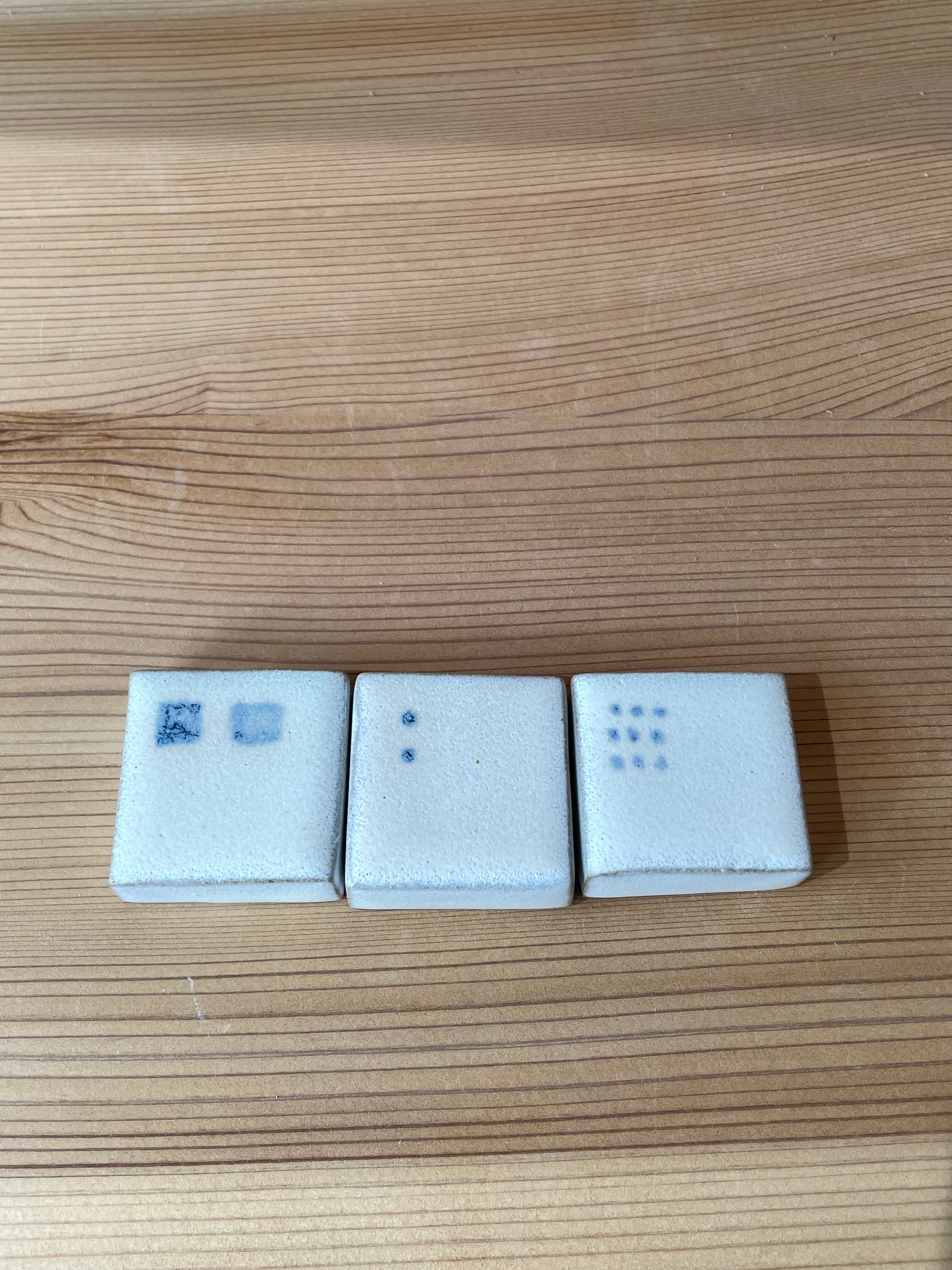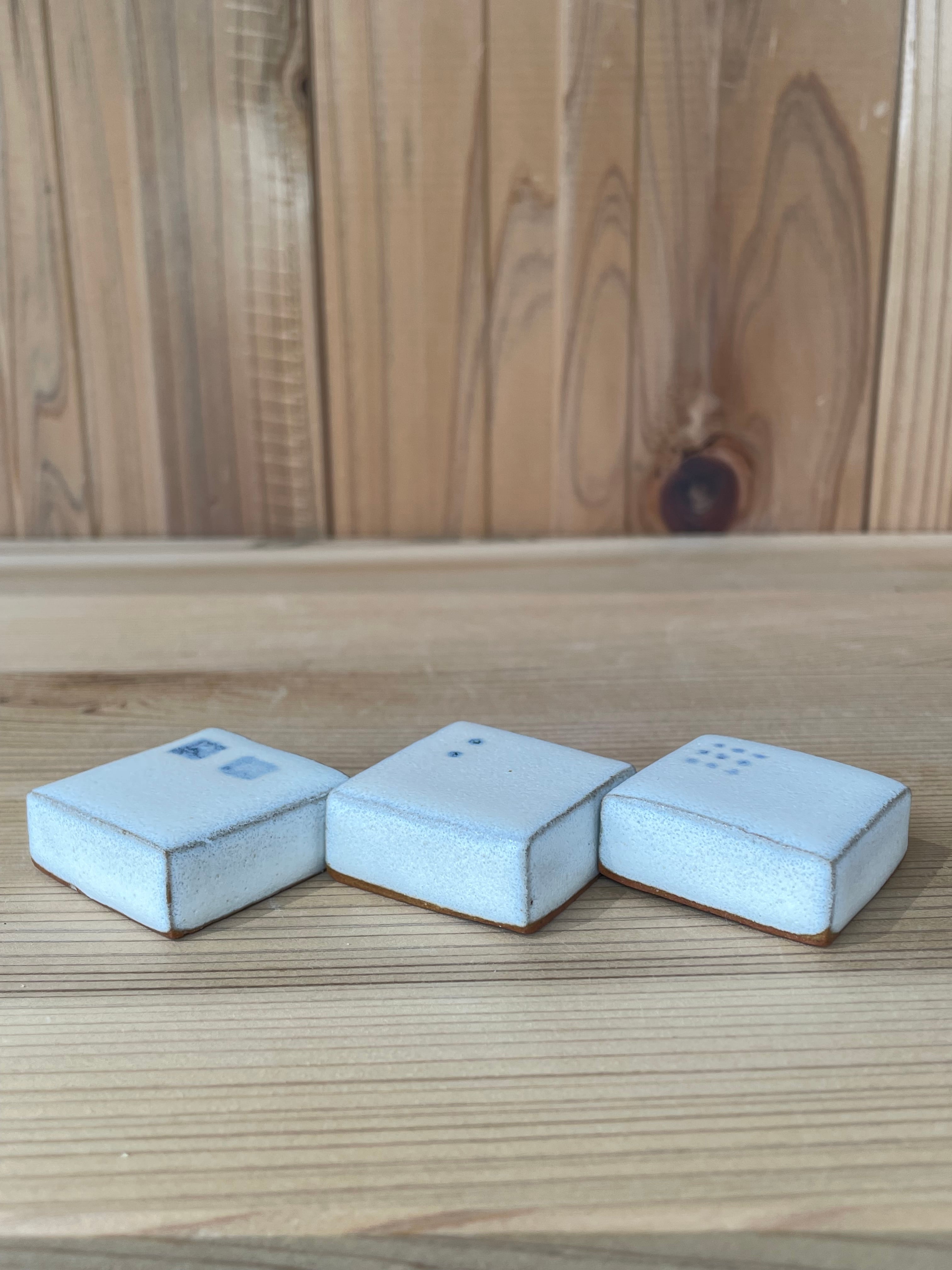 一つ一つ丁寧に手作業で作られた箸置きはマットな白色にシンプルな角型デザインが特徴で、アクセントに手書きの模様がデザインされております。お箸を置く際には、そのしっくりとした手触りが心地よく、普段使いにご利用いただけます。