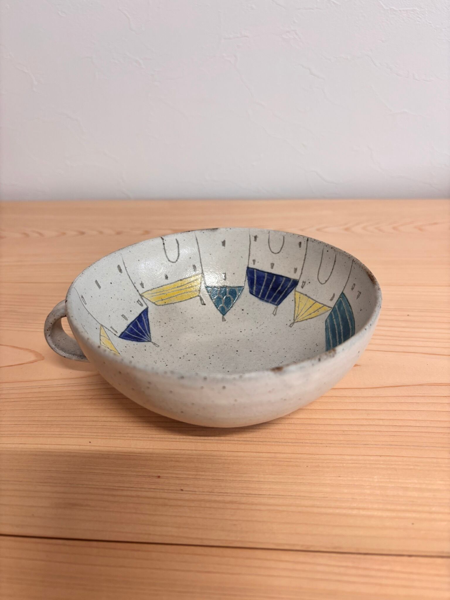 会津本郷焼の人気作家【樹ノ音工房】のスープボウルです。手書きの可愛い絵柄が内側に描かれていています。飲むたびに少しづつ絵柄が見えてくる楽しい器です。たっぷりとしたサイズはスープだけではなくシリアルやヨーグルトなど入れたりサラダなどをいれてもオシャレです!