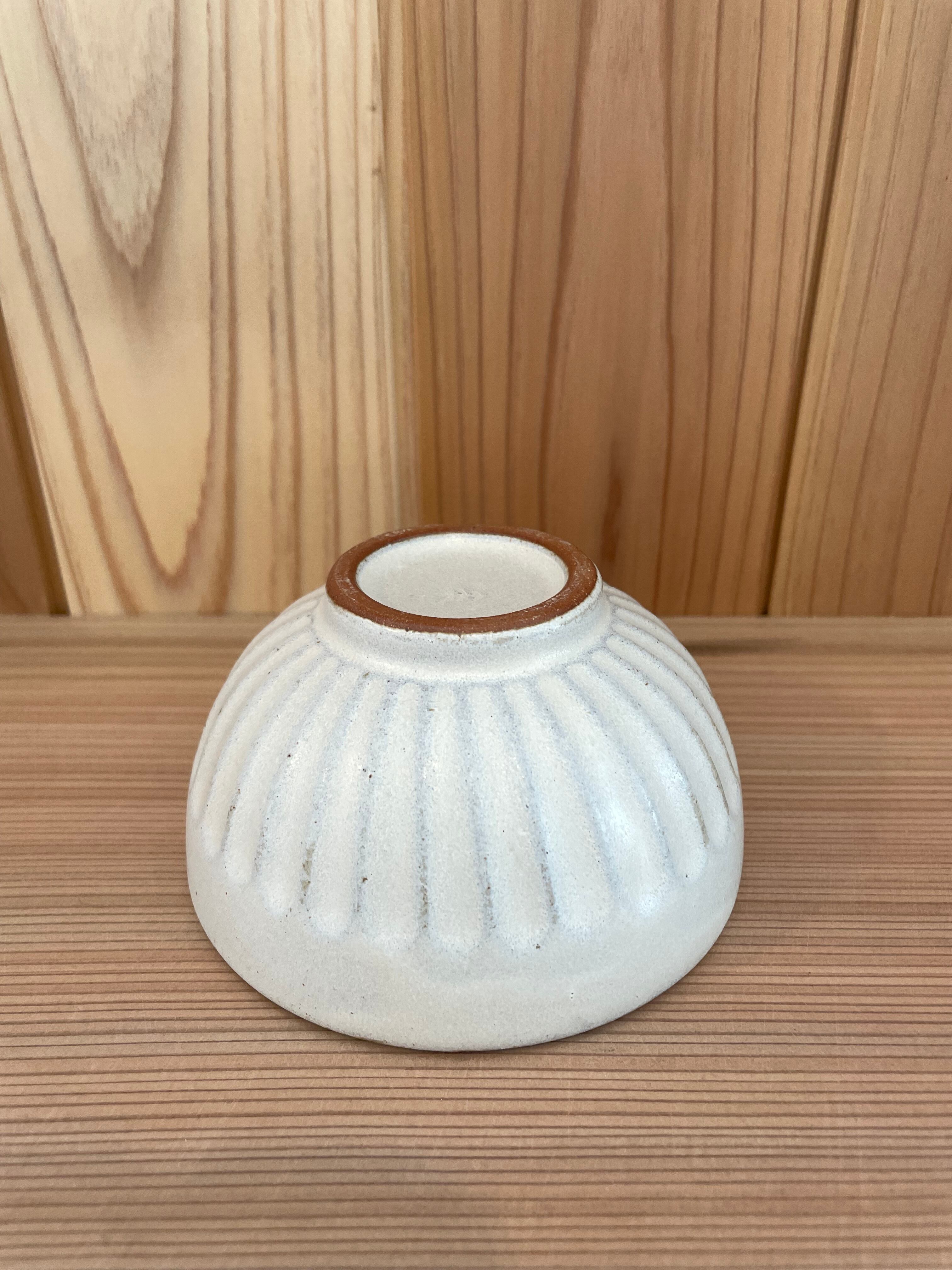 一つ一つ丁寧に手作業で作られたこの碗は、カンナで削った「しのぎ」という技法で1本1本彫られたデザインがとても素敵です。マットな白とたっぷりとした深みのあるこのお椀は手に取りやすいサイズ感とシンプルなデザインが毎日の食事を楽しくしてくれることでしょう。